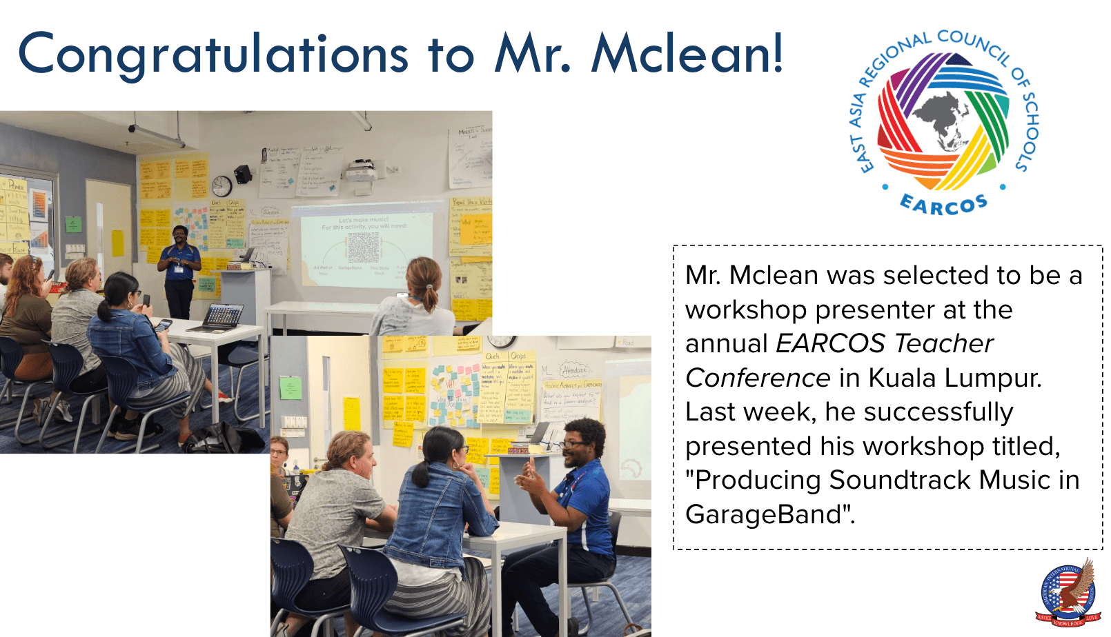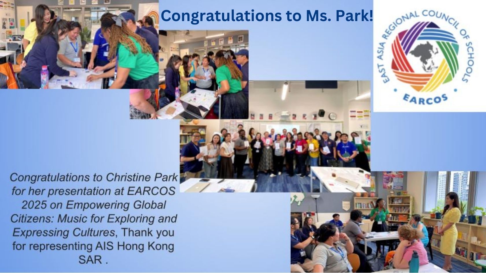 Congratulations to Mr. Robert Mclean and Ms. Christine Park for their successful presentations at the EARCOS Teacher Conference 2025 in Kuala Lumpur last week. Mr. Mclean shared insights on, “Producing Soundtrack Music in GarageBand,” while Ms. Park explored, “Empowering Global Citizens: Music for Exploring and Expressing Cultures,” inspiring educators worldwide. Their dedication to innovative teaching methodologies is truly commendable. Thank you for your generous contributions to the educational community and for representing our school on the international stage so well.