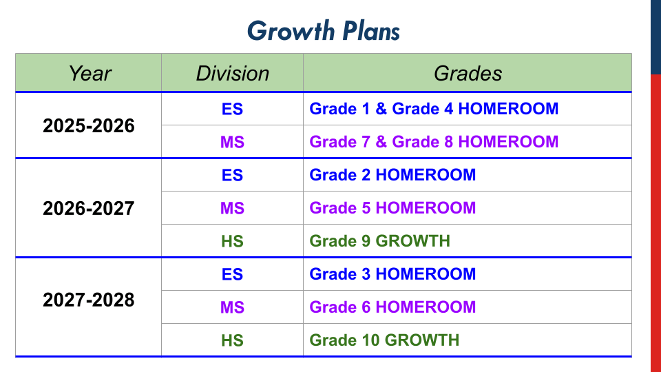 I am pleased to share that AIS will be growing next year, with plans to continue to grow strategically over the coming three years. Demand for spaces is high, and we are delighted to be able to expand our offerings to include more students and families. The table below illustrates the classes that will be added in the fall of 2025, along with the anticipated expansion timeline for 2026-2027 and 2027-2028.